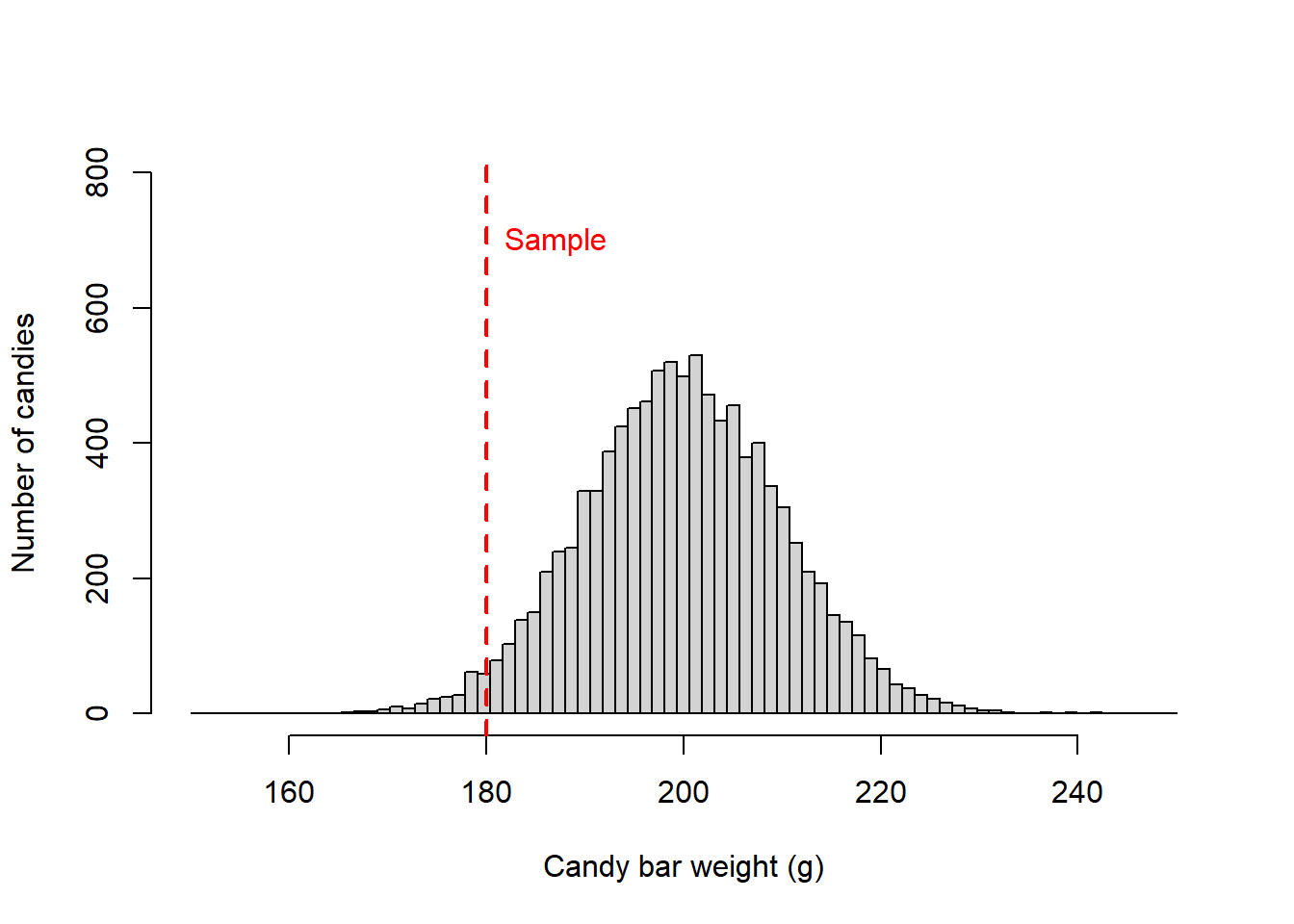 PopulationWeight=200 # Average weight reported in the lable of the candy bar. This of this as the population mean.