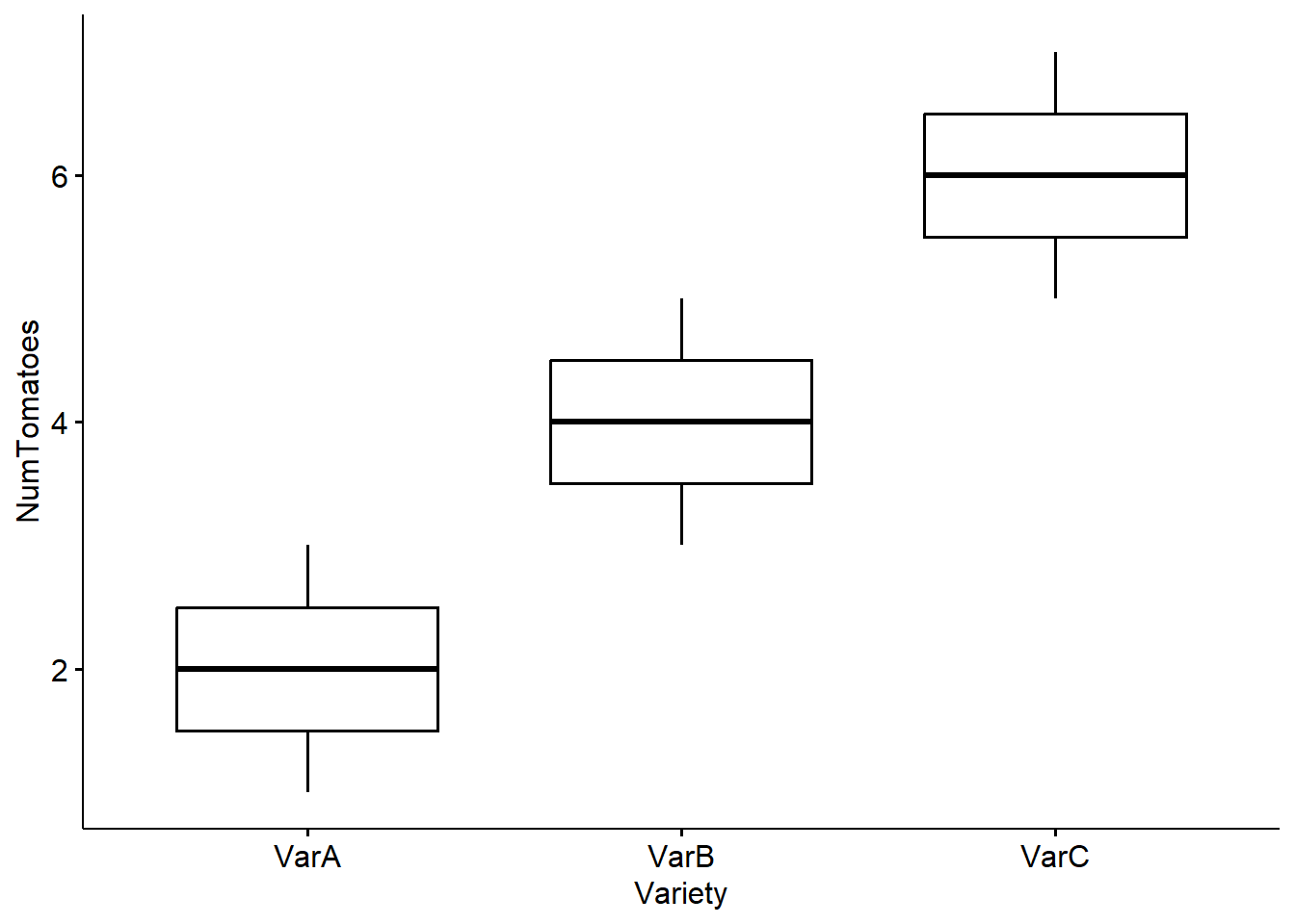 Boxplots allow you to visualize the mean and the standard deviations of each group. From the plot above, you can see clearly that not only the mean tomato production of the three varieties are different, but their variances do not overlap.