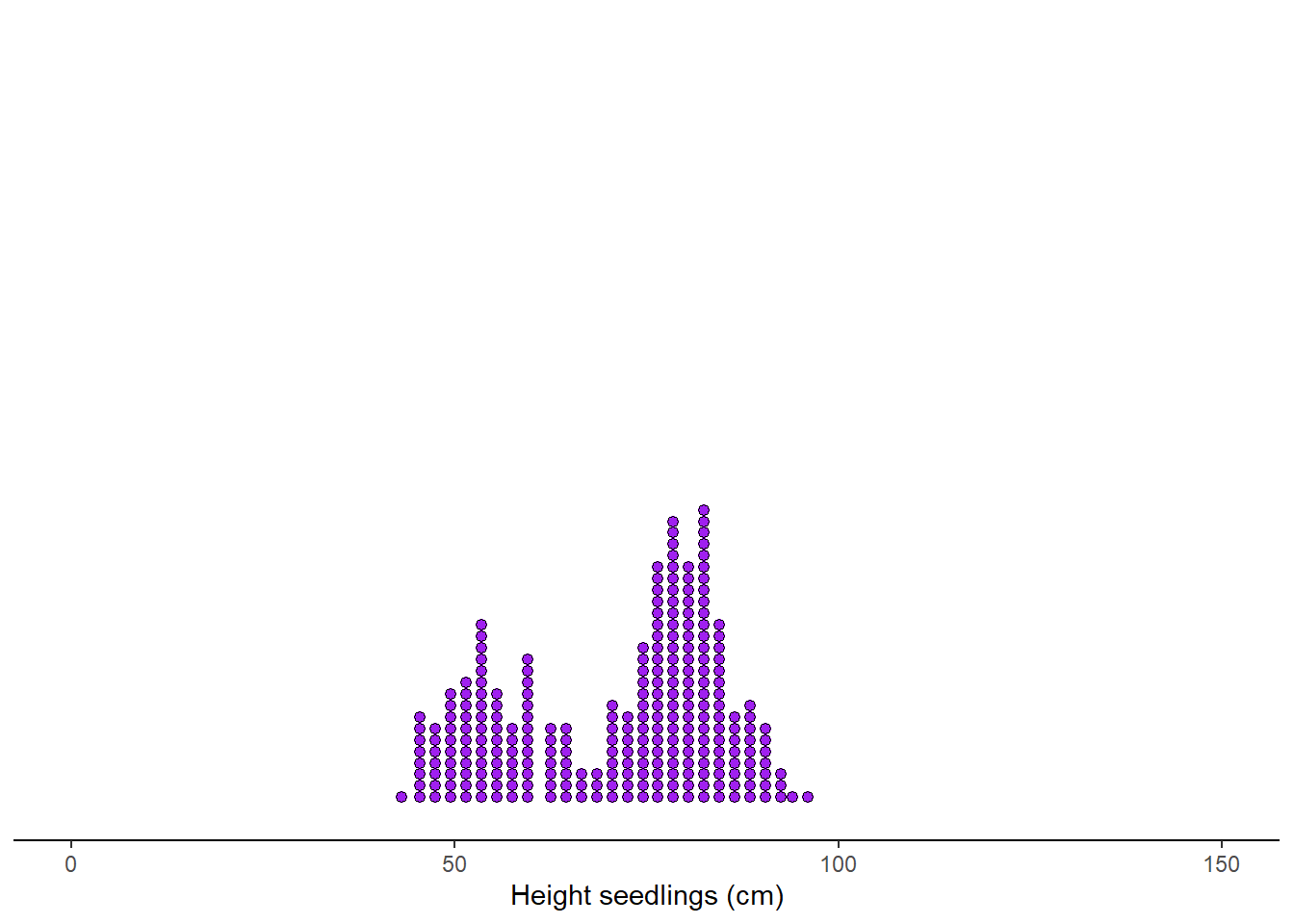 Lets image that the plot below is the number of seedlings (points) at each height in my nursery. Interesting, ahh?. That type of distribution is called bimodal (there are two peaks in the data). Clearly, there is something going on in my nursery, some seedlings are doing particularly better than others.