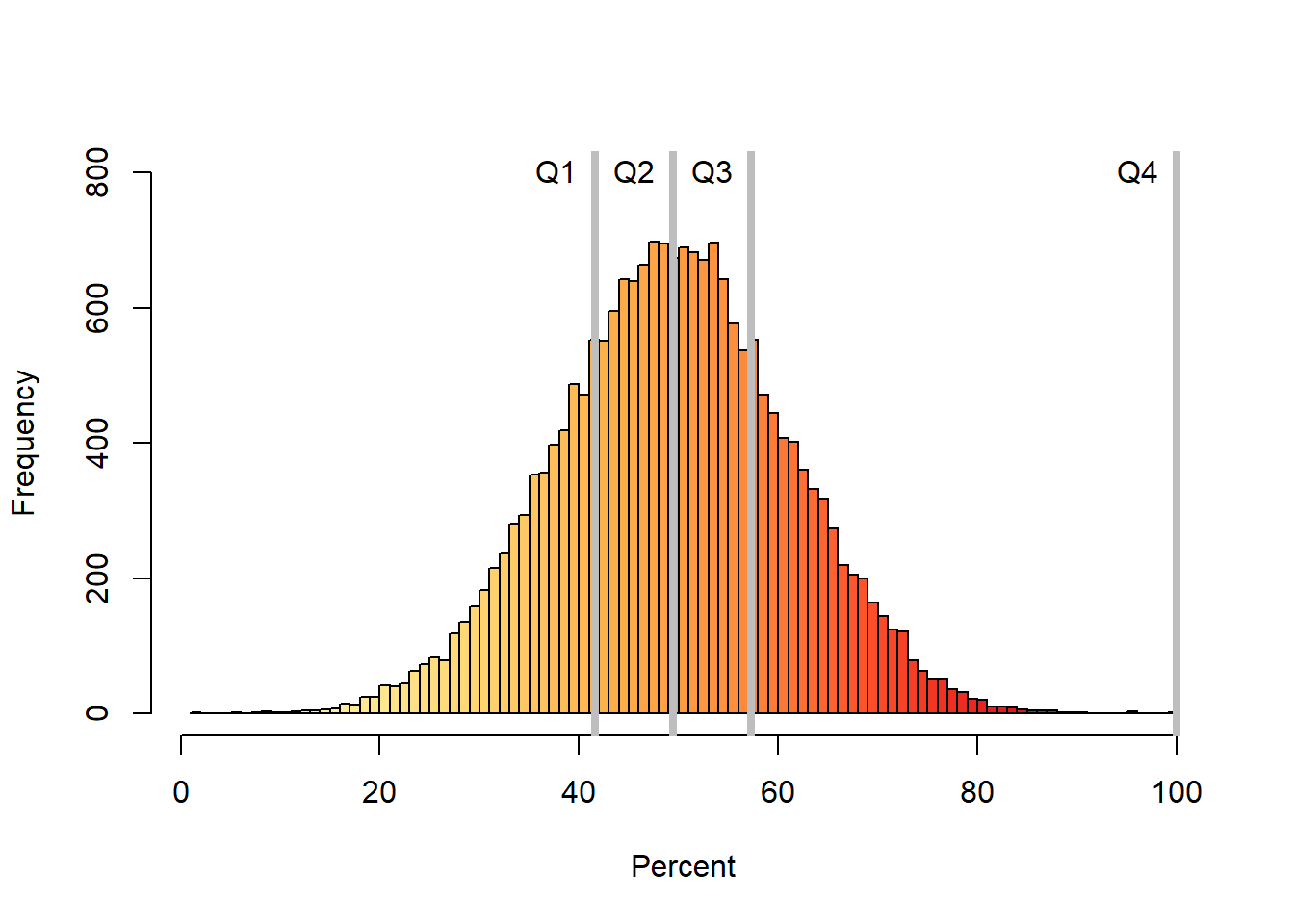 hist(dt$x, col=Colors,main = NULL,breaks = 100, ylim=c(0,800),xlab="Percent", ylab="Frequency")