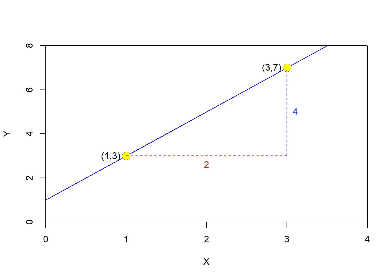 \[\begin{equation} m = \frac{\Delta y}{\Delta x}= \frac{4}{2}=2 \end{equation}\]