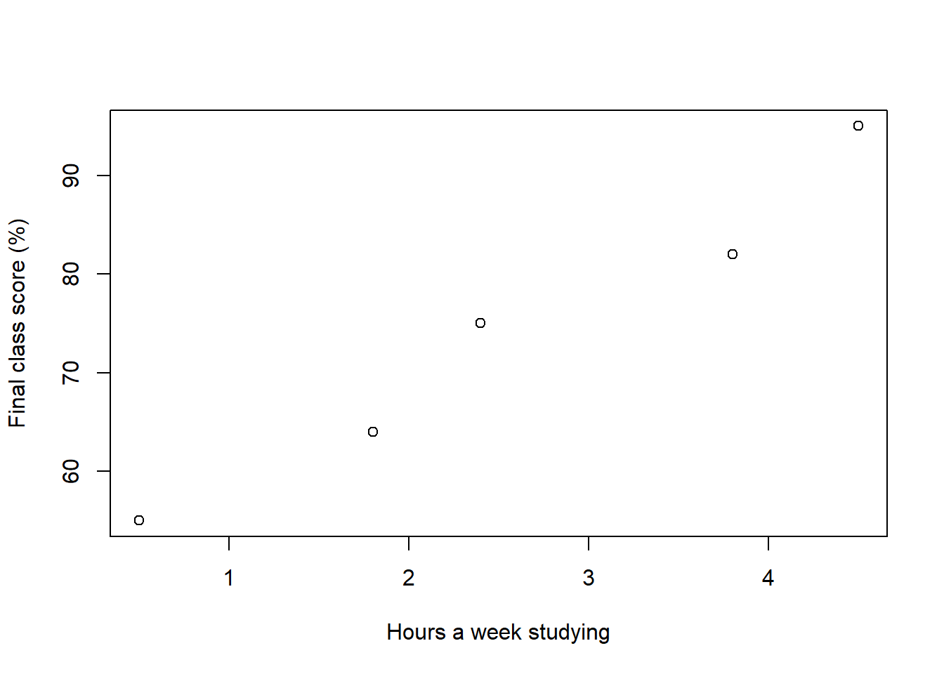 Say, I asked five students how long they studied each week and the grade they got in my prior classes. These were the data: